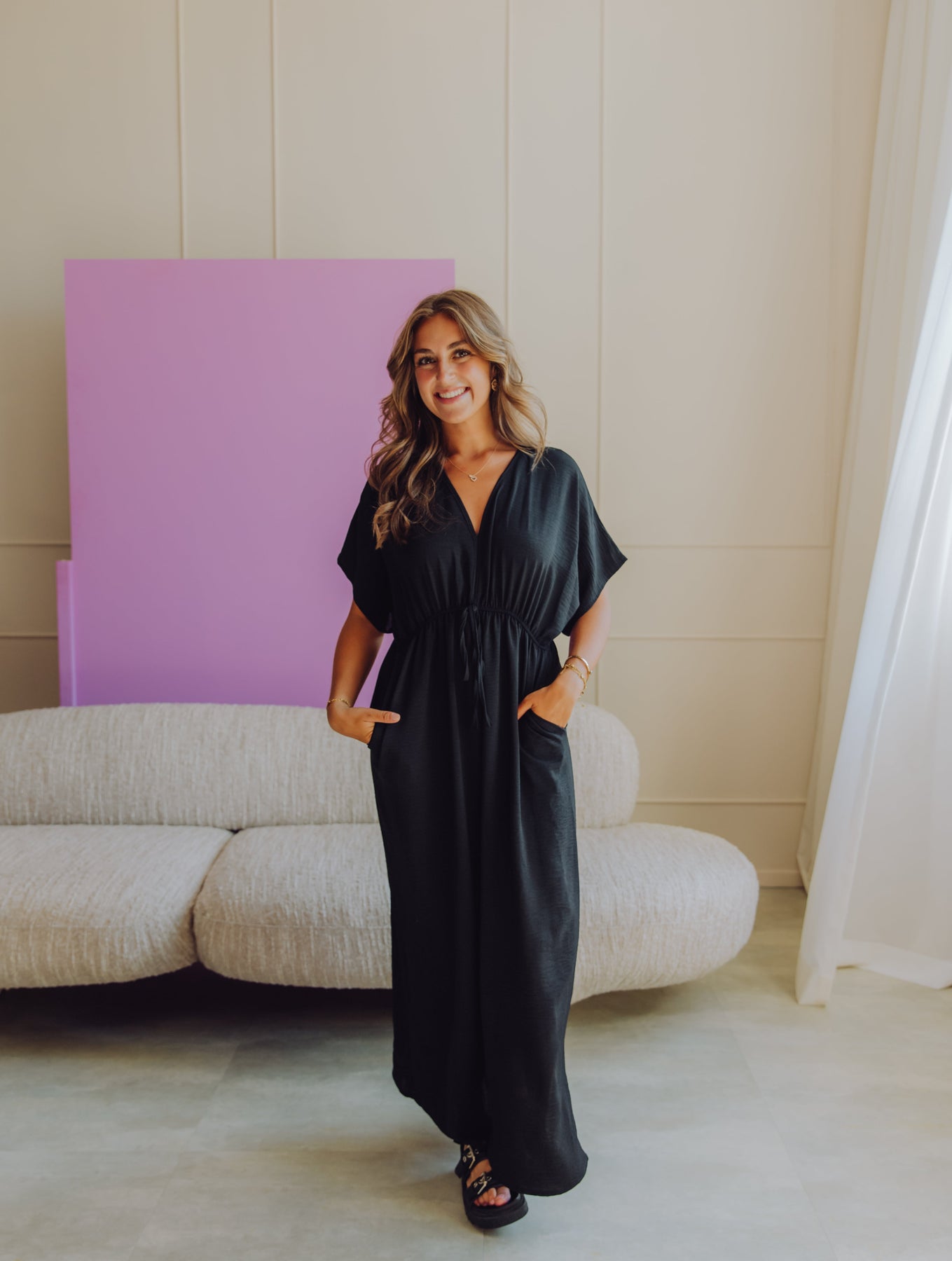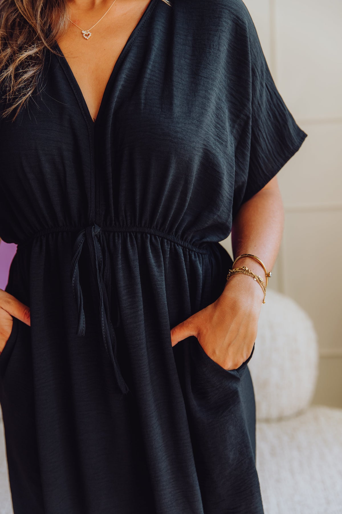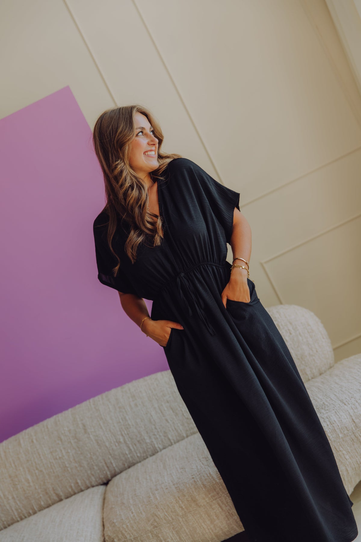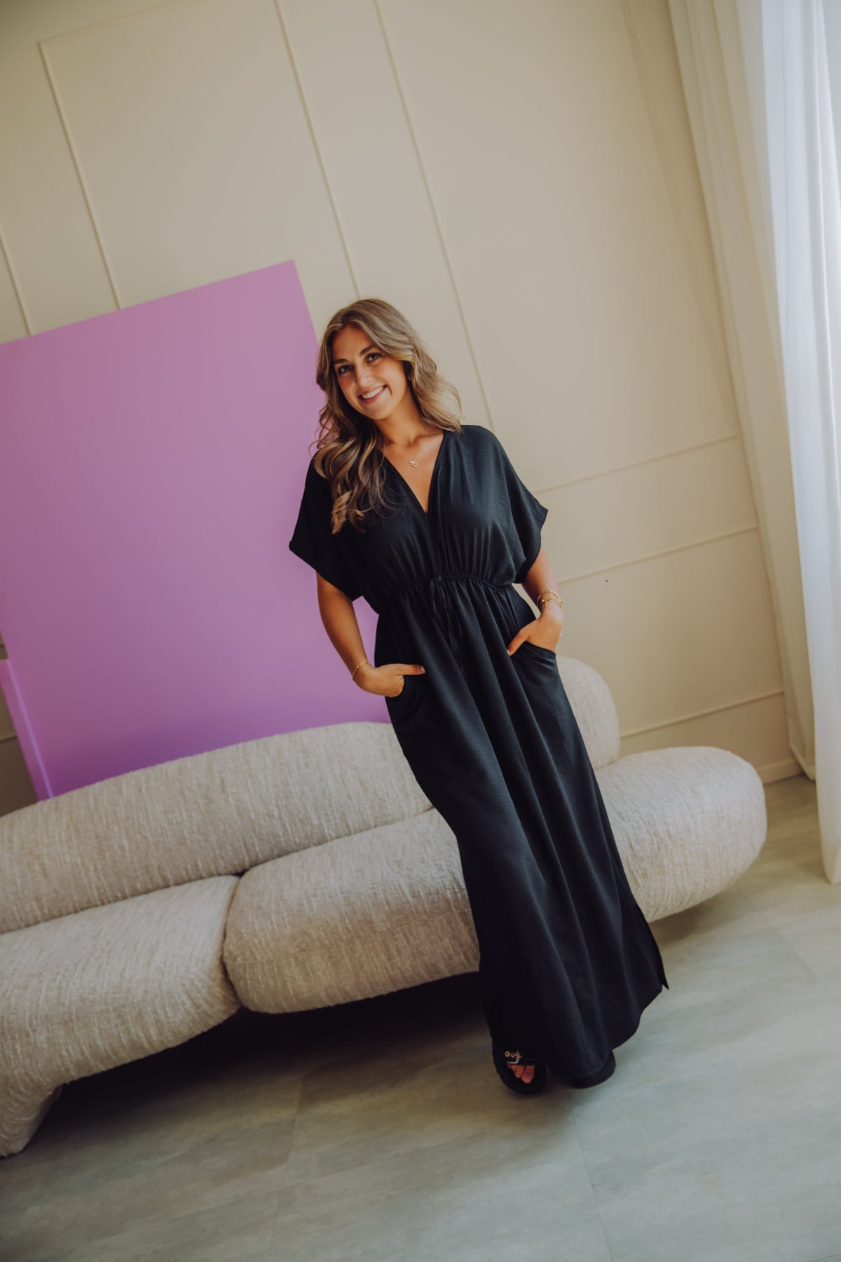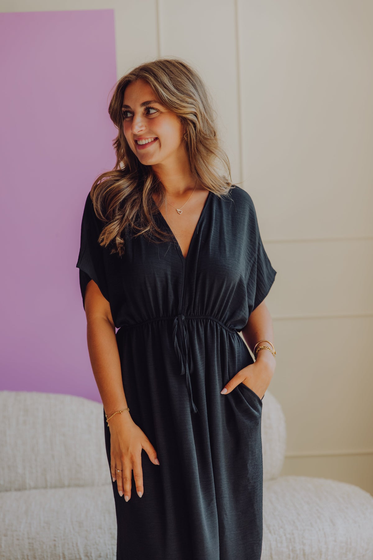 The black Isel dress is a long dress with short sleeves and a tie at the waist. It has a V-neck, two side pockets, and a side slit. This dress is perfect for warmer summer days!
